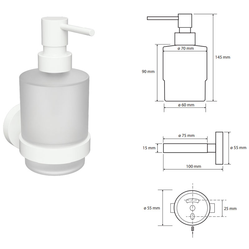 Современный настенный дозатор для жидкого мыла элегантно подойдёт для любой ванной комнаты. Латунь делает товар долговечным и удобным в использовании там, где высокое воздействие влаги и перепадов температур. Поверхность коллекции WHITE белая, поэтому универсальна и отлично вписывается в интерьер. Матовое стекло отлично сочетается с белым.