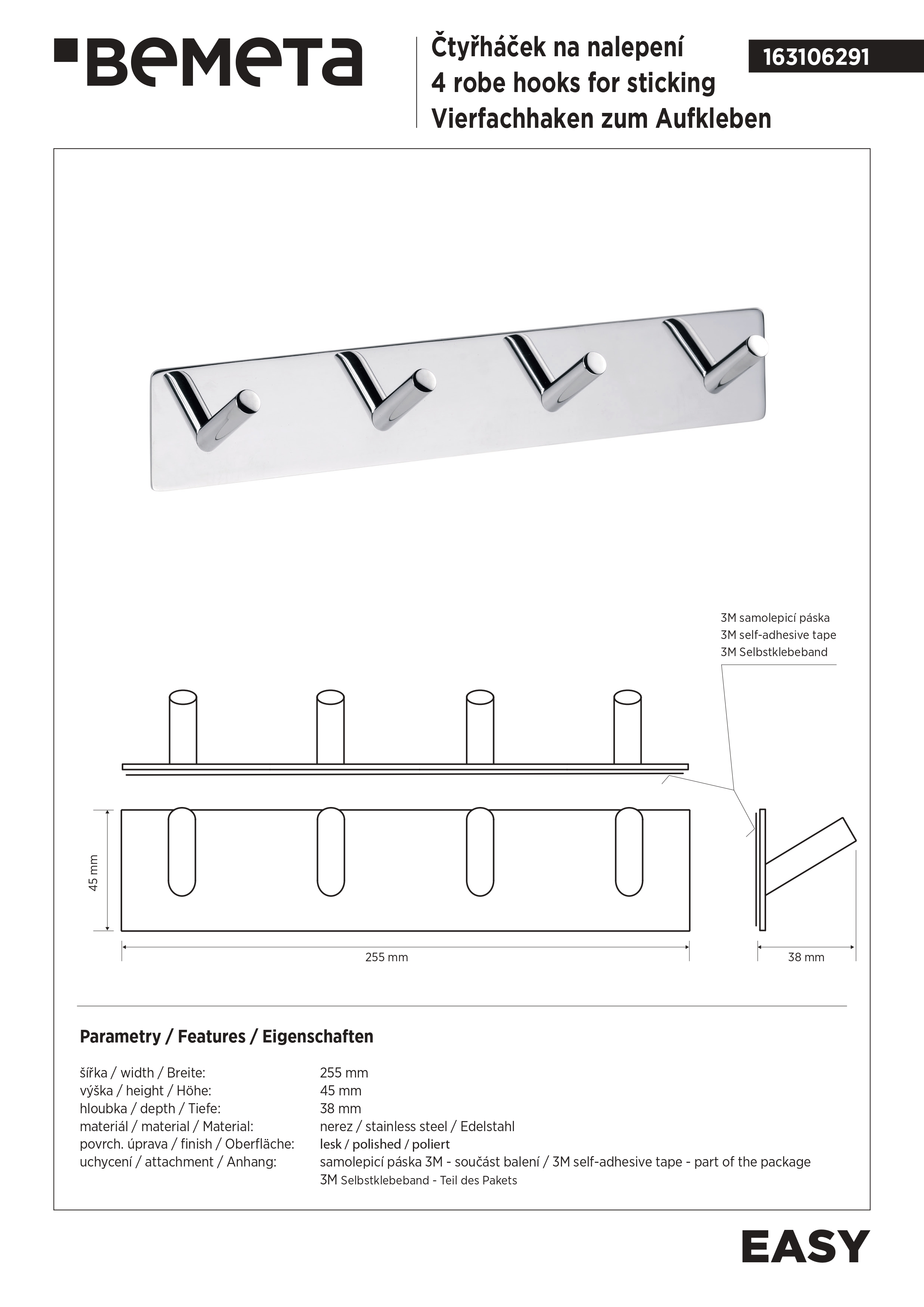 вариант d-хром: арт. 163106291 планка на 4 крючка, крепление на 3M