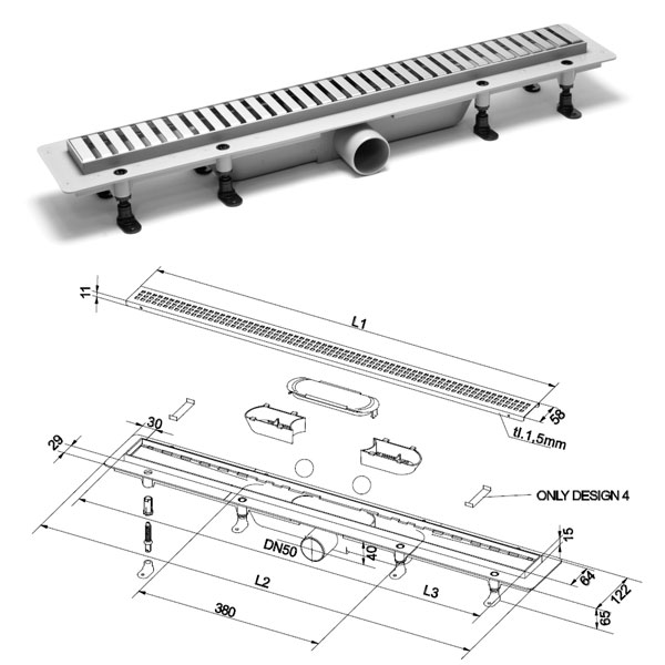 Серия NEW DESIGN 3 - это линейка трапов с палосчатой перфорированной решёткой из нержавеющей стали для монтажа к полу. Корпус трапа сделан из полипропилена высокого качества. Прочная решётка из нержавеющей стали AISI 304, толщина которой 1,5 мм. Крепкий и надёжный фланец у трапа специально создан не узким для удобной качественной и простой установки, а полипропилен в 1,5 мм делает продукт особенно надёжным. Это доказывает максимальная нагрузка, которую гарантирует производитель - 300 кг.