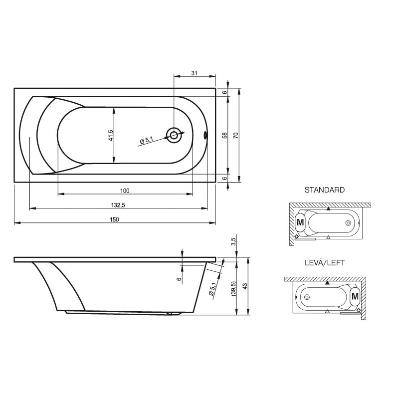 вариант 150x70-белый: арт. B058001005 ванна прямоугольная Miami 150